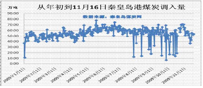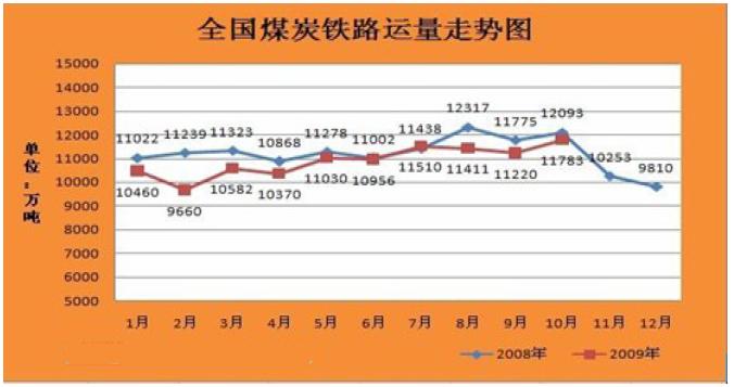 進入第四季度前期,本應(yīng)該是電力消耗的低谷期,可是華東等地的持續(xù)高溫給煤炭市場提高了溫度,華中氣溫偏高致使該地區(qū)干旱給煤炭市場增加了動力,當時的鐵路進港煤炭運輸持續(xù)相對偏低給煤市添加了“催化劑”;當鐵路部門突然決定增加進港煤炭運輸時,沿海的大風(fēng)阻塞了出港煤炭的外流,導(dǎo)致秦港煤炭半個月的時間增加了近500 萬噸。這種大幅波動,與鐵路運輸?shù)牟粎f(xié)調(diào)有很大的關(guān)系(具體如圖一和圖二),從圖一可以看出,鐵路運往港口的煤炭量并沒有隨經(jīng)濟回暖而增加,相反進入8 月份進港煤炭出現(xiàn)不穩(wěn)定情況,港口煤炭價格大幅上漲也是在此期間開始的;從圖二可以看出,8-9 月份全國鐵路煤炭運輸明顯減少,按今年鐵路運輸?shù)木o張程度,相比08 年有很大差別,去年是緊張,今年是偏緊,近期對煤炭的搶運使部分地區(qū)煤炭庫存增加的如此快就是很好的佐證,08 年“迎風(fēng)度夏”平均日進港煤炭60 萬噸以上,最高時達86 萬噸。