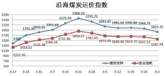 本周,煤炭需求小幅回落,沿海煤炭貨種運價指數(shù)全線下跌,截至6月2日沿海散貨運價指數(shù)報收于1547.94點,較上周下跌5.5%;沿海煤炭貨種運價指數(shù)報收于1827.75點,較上周下跌7%。其中,秦皇島-廣州、上海、寧波、福州航線運價指數(shù)分別報1863.02點、2169.93點、1599.85點和1259.26點,分別較上周下跌3.5%、8.2%、8.9%和4.4%。目前以上四條航線的運價分別為75元/噸、54元/噸、52元/噸和60元/噸,分別較上周下跌了3元、6元、6元和3元每噸。部分地區(qū)受季節(jié)性影響水電有所增加,火電出現(xiàn)小幅萎縮,且氣溫普遍低于去年平均水平,社會用電增長放緩,致使煤炭需求下降。