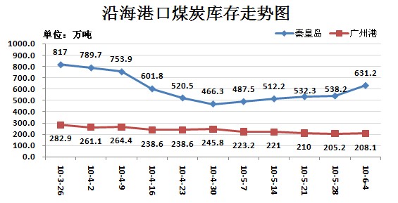 本周,由于秦皇島出現(xiàn)大霧封航情況,影響港口正常發(fā)運,導(dǎo)致庫存快速回升。截至2010年6月4日,秦皇島當(dāng)日合計鐵路調(diào)入量為68.3萬噸,當(dāng)日合計港口吞吐量為55.7萬噸,月日均調(diào)入量為68萬噸,月日均吞吐量為64萬噸。秦皇島港口煤炭庫存為631.2萬噸,較上周同期上漲17.28%。