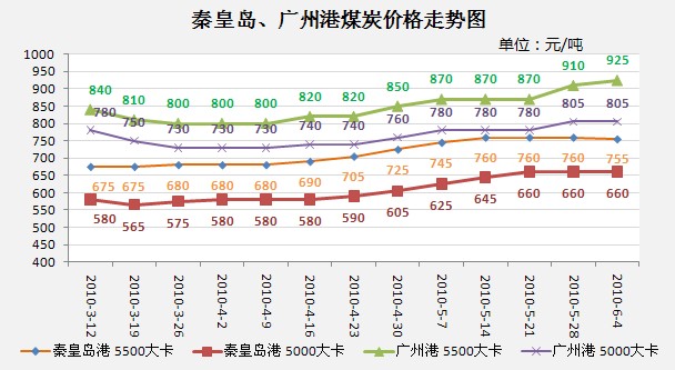 本周,秦皇島港終止了平穩(wěn)增長的勢頭,開始出現(xiàn)小幅調(diào)整回落。截至2010年6月4日,秦皇島港5800大卡、5500大卡、5000大卡的煤炭平均指導(dǎo)價格為785元/噸、755元/噸和655元/噸,分別較上周下跌5元/噸。