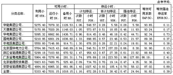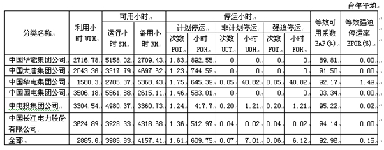 2010年上半年,華能、大唐、華電、國(guó)電、中電投集團(tuán)公司、各主要地方電力投資公司火電機(jī)組等效可用系數(shù)為91.82%,同比提高0.07個(gè)百分點(diǎn);臺(tái)年平均非計(jì)劃停運(yùn)次數(shù)和時(shí)間分別為0.51次和38.42小時(shí),比去年同期分別上升0.11次和19.71小時(shí)。機(jī)組臺(tái)年平均利用小時(shí)為5333.40小時(shí),同比提高682.89小時(shí)。